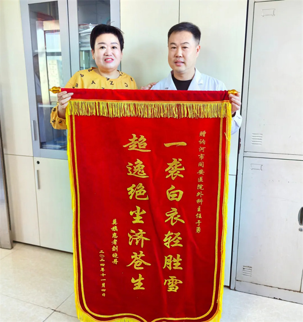 为了表达全家对外科团队的感激之情,刘晓丹特意定制了锦旗,上面书写着:“无影灯下精术展,德艺双馨谱华章”。这十四个字,不仅是对医护人员精湛医术的高度赞扬,更是对他们医德高尚、无私奉献精神的深深敬仰。在刘晓丹看来,这面锦旗不仅是对医护人员的感谢,更是对他们辛勤付出与卓越贡献的最好见证。